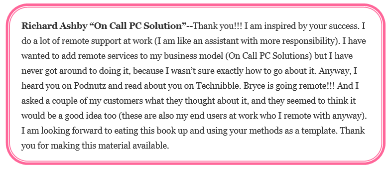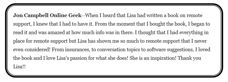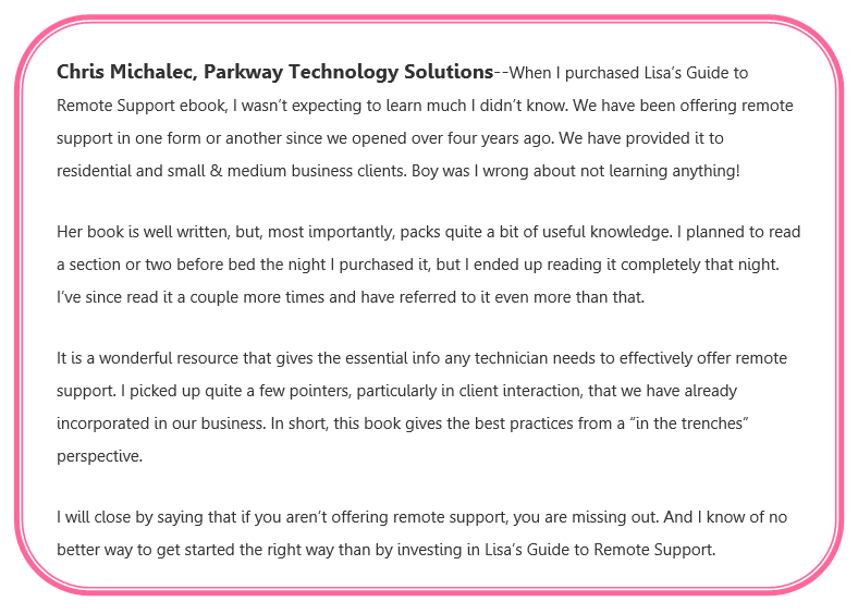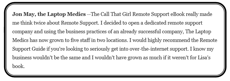 Lisa has built a successful national remote support and repair business with the tools detailed in these eBooks; check them out so you can learn from an industry leader and run a profitable computer repair business, too! Her most popular eBook, The Guide to Remote Support is in it’s 3rd edition packed with 92 pages of current learning opportunities to help your business soar with the cloud.